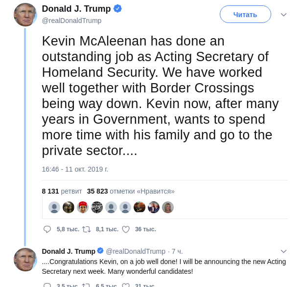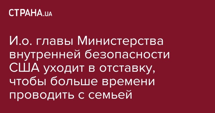 Президент Соединенных штатов Америки Дональд Трамп написал, что исполняющий обязанности министра внутренней безопасности США Кевин Макалинан подал в отставку. Об этом американский президент написал в Twitter.