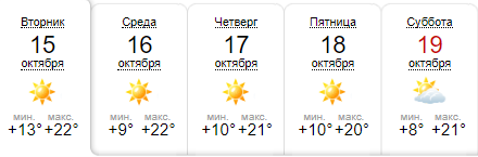Сайт Weather.com сообщает, что в ближайшие дни погода будет преимущественно солнечной. Самым теплым днем будет 15 октября, когда температура поднимется до +23. В среду и четверг, 16 и 17 октября, будет до +22 днем и +7 ночью. Такая погода продержится до конца недели.