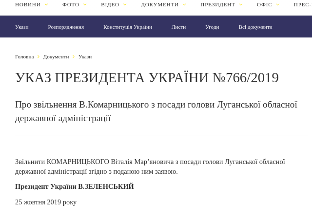 Указом №766/2019 глава государства уволил с этой должности Виталия Комарницкого.
