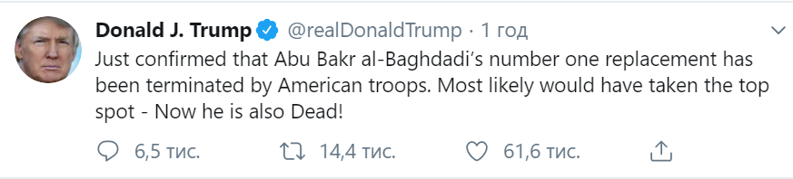 "Только что подтверждено, что номер один на смену Абу Бакру аль-Багдади также уничтожен американскими солдатами. Он также мертв", - говорится в опубликованном сообщении в твиттере Трампа во вторник, 29 октября.
