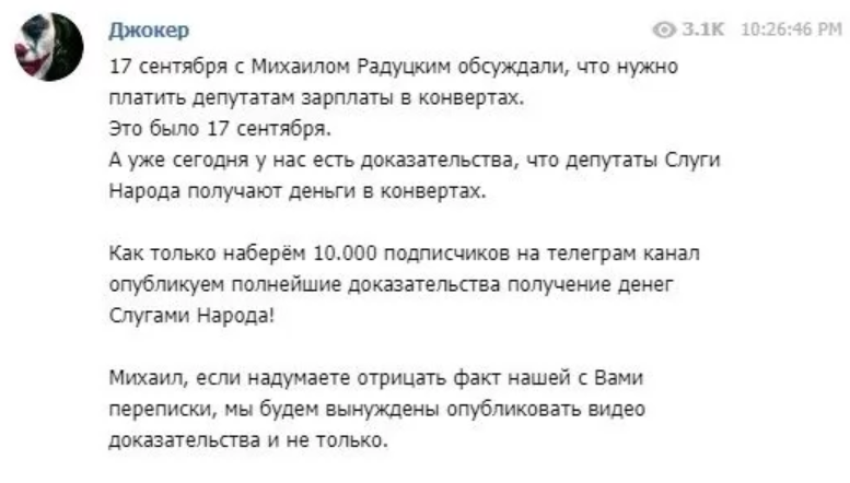 Пранкер "Джокер", известный "розыгрышем" нардепа Богдана Яременко, опубликовал переписку, в которой якобы обсуждал с главой Комитета Верховной Рады по вопросам здоровья нации, медицинской помощи и медицинского страхования Михаилом Радуцким, сопартийцем Яременко по "Слуге народа", получение нардепами "денег в конвертах".