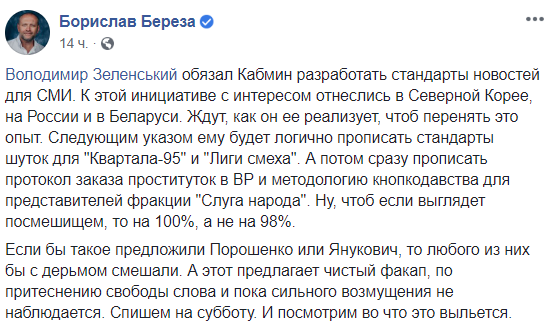 Если бы такое предложили Порошенко или Янукович, то любого из них бы с дерьмом смешали. А этот предлагает чистый факап, по притеснению свободы слова и пока сильного возмущения не наблюдается. Спишем на субботу. И посмотрим во что это выльется".