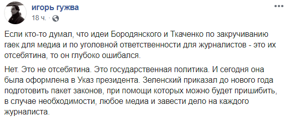 Нет. Это не отсебятина. Это государственная политика. И сегодня она была оформлена в Указ президента. Зеленский приказал до нового года подготовить пакет законов, при помощи которых можно будет пришибить, в случае необходимости, любое медиа и завести дело на каждого журналиста".