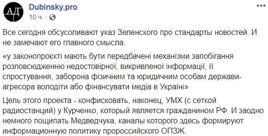 Цель этого проекта - конфисковать, наконец, УМХ (с сеткой радиостанций) у Курченко, который является гражданином РФ. И заодно немного пощипать Медведчука, каналы которого здесь формируют информационную политику пророссийского ОПЗЖ", - пишет нардеп Александр Дубинский.