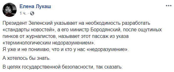 "Президент Зеленский указывает на необходимость разработать "стандарты новостей", а его министр Бородянский, после ощутимых пинков от журналистов, называет этот пассаж из указа "терминологическим недоразумением".
