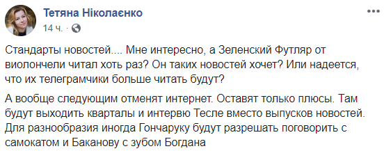 "Следующим отменят интернет. Оставят только плюсы. Там будут выходить кварталы и интервю Тесле вместо выпусков новостей. Для разнообразия иногда Гончаруку будут разрешать поговорить с самокатом и Баканову с зубом Богдана".