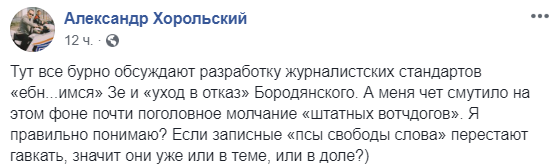 "Меня чет смутило на этом фоне почти поголовное молчание "штатных вотчдогов". Я правильно понимаю? Если записные "псы свободы слова" перестают гавкать, значит они уже или в теме, или в доле?".