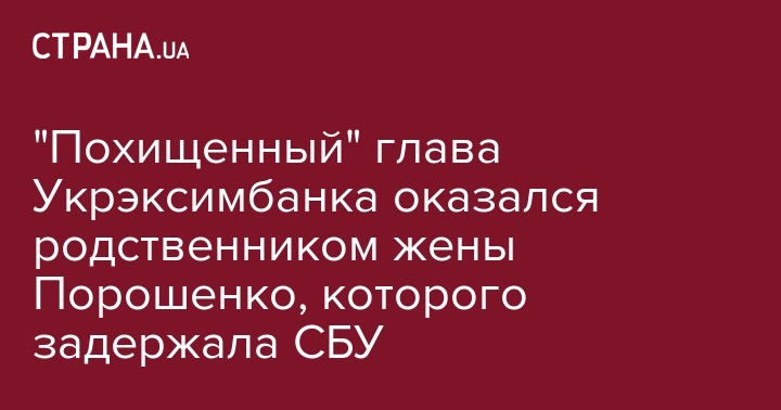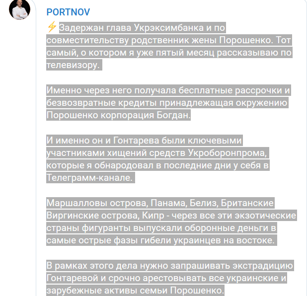"Задержан глава Укрэксимбанка и по совместительству родственник жены Порошенко. Тот самый, о котором я уже пятый месяц рассказываю по телевизору.