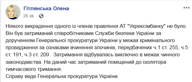 "Никакого похищения одного из членов правления АО "Укрэксимбанк" не было. Он был задержан сотрудниками Службы безопасности Украины по поручению Генеральной прокуратуры Украины в рамках уголовного производства по признакам совершения преступлений, предусмотренных ч.1 ст. 255, ч.5 ст. 191, ч.3 ст. 209. Задержание происходило исключительно в рамках действующего законодательства. В настоящее время задержанный помещен в изолятор временного содержания. Дело ведет Генеральная прокуратура Украины", - написала Елена Гитлянская.