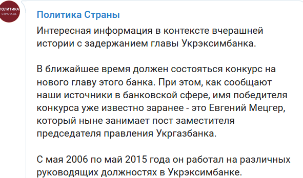 По словам источников, в конкурсе победит Евгений Мецгер, который сейчас занимает пост заместителя председателя правления "Укргазбанка".