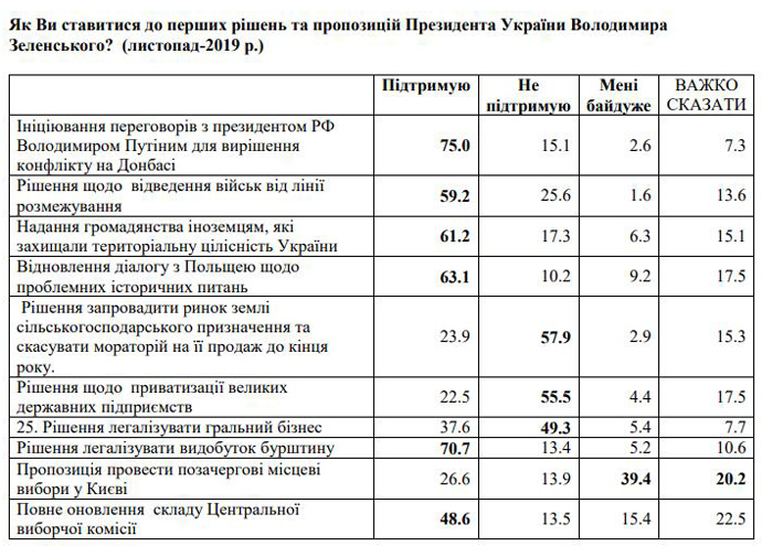 "Граждане преимущественно положительно относятся к первым решениям и предложениям президента Владимира Зеленского: инициирование переговоров с президентом РФ Владимиром Путиным для разрешения конфликта на Донбассе (положительно - 75%, отрицательно - 15%), решение по отводу войск от линии разграничения (положительно - 59%, отрицательно - 26%)", - говорится в результатах проведенного исследования.