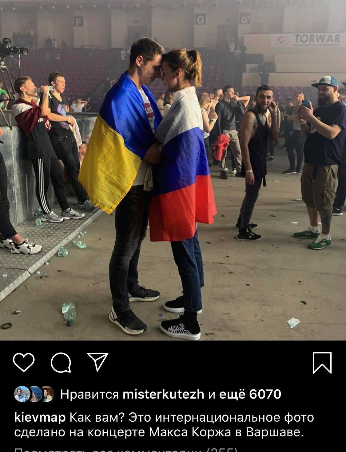 Парочка с флагами Украины и России обнялась на концерте Макса Коржа в Польше. Фото