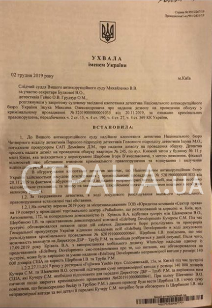 В постановлении, в частности, говорится, что в начале сентября Щербина встречался с представителем девелоперской компании "Edelburg Development" Кучером С.М. и в ходе встречи обсуждались действия следователей ГБР и прокуроров ГПУ в отношении должностных лиц "Edelburg Development" в рамках дела №62019100000000641.