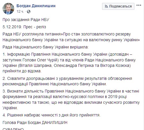 Совет Национального банка Украины признал валютно-курсовую политику ведомства в 2019 году неэффективной, поскольку она не соответствует вызовам современного развития Украины. Об этом заявил глава Совета НБУ Богдан Данилишин.