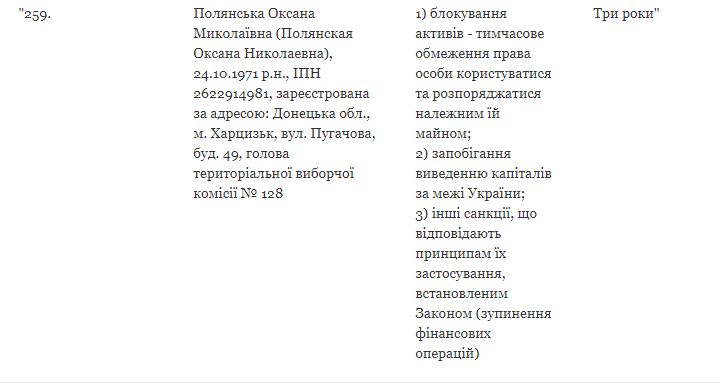 В отношении всех пяти новых фигурантов в течение трех лет будут применяться следующие ограничения: приостановление всяческих финансовых операций; блокирование активов (временное ограничение права человека пользоваться и распоряжаться собственным имуществом); предотвращение вывода капиталов за пределы Украины.