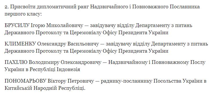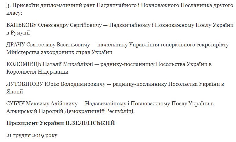 Сегодня, 21 декабря, стало известно, что украинский лидер Владимир Зеленский подписал указ №934/2019, согласно которому ряду лиц присвоены дипломатические ранги. Текст указа представлен на официальном сайте президента.