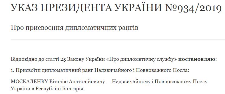 Так, дипломатический ранг чрезвычайного и полномочного посла присвоили чрезвычайному и полномочному послу Украины в Республике Болгария Виталию Москаленко присвоили.