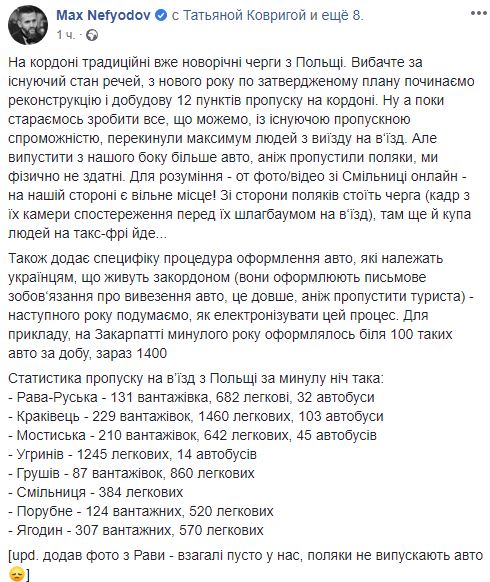 Глава Таможенной службы Максим Нефедов на своей странице в Facebook сообщил, что на границе с Польшей наблюдаются огромные очереди.