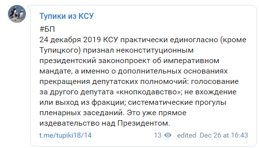 Как сообщает тг-канал "Тупики из КСУ", против законопроекта Зеленского не голосовал только глава КС Александр Тупицкий.