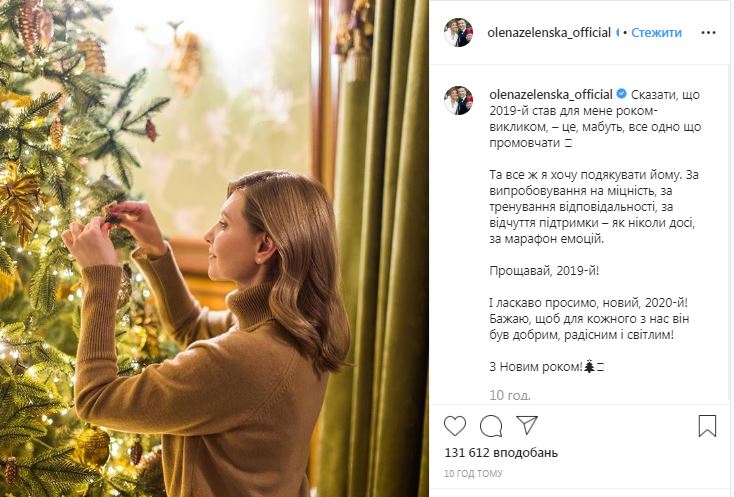 "Прощай, 2019-й! И добро пожаловать, новый, 2020-й! Желаю, чтобы для каждого из нас он был добрым, радостным и светлым! С Новым годом!", - резюмировала жена президента.