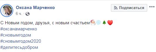 Телеведущая, жена политика Виктора Медведчука Оксана Марченко тоже кратко поздравила украинцев в Facebook: "С новым годом, друзья, с новым счастьем" и опубликовала фото в уютной домашней обстановке.
