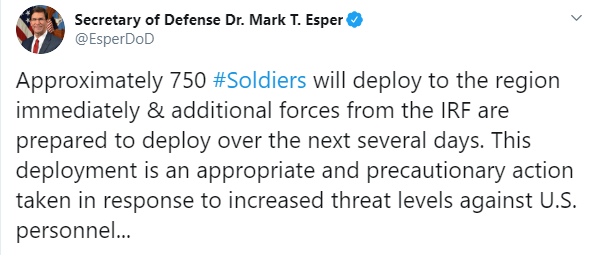 "Около 750 солдат будут незамедлительно размещены в регионе. Дополнительные силы готовы к отправке в ближайшие несколько дней. Данное развертывание является надлежащей и предупредительной мерой в ответ на растущую угрозу американскому персоналу и объектам", - говорится в сообщении главы Пентагона. Также Эспер заявил, что США будут защищать своих граждан, где бы они ни находились.