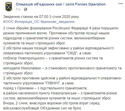 "2 января вооруженные формирования Российской Федерации 4 раза нарушили режим прекращения огня. Вследствие вражеских обстрелов потерь среди военнослужащих Объединенных сил не было", - говорится в сообщении.