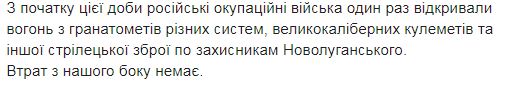 "С начала текущих суток российские оккупационные войска один раз открывали огонь из гранатометов различных систем, крупнокалиберных пулеметов и другого стрелкового оружия по защитникам Новолуганское. Потерь с нашей стороны нет", - добавили в штабе.
