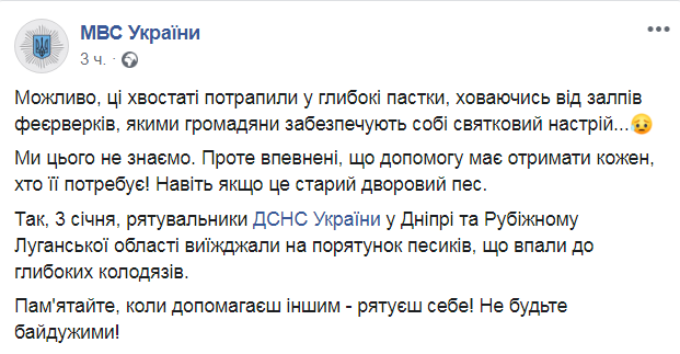 Так, 3 января работники ГСЧС в Днепре и в Рубежном Луганской области несколько раз выезжали на спасение собак, попавших в глубокие колодцы.