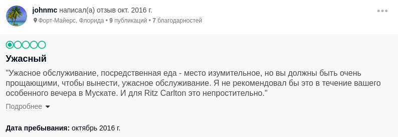 "Ужасное обслуживание, посредственная еда - обстановка восхитительна, но вы должны быть очень прощающими, чтобы мириться с ужасным обслуживанием. Я не рекомендовал бы это для вашего особенного вечера в Маскате. А для Ритца Карлтона это непростительно", - написал один из клиентов.