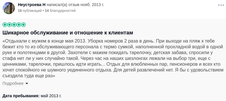 "Шикарное обслуживание и отношение к клиентам. Отдыхали с мужем в конце мая 2013. Уборка номеров 2 раза в день. При выходе на пляж к тебе бежит кто то из обслуживающего персонала с термосумкой, наполненной прохладной водой в одной руке и полотенцами в другой. Захотели с мужем покидать тарелочку, детская забава, спросили у стафа (персонала - Ред.), нет ли у них случайно такой. Через час на наших шезлонгах лежали на выбор три, еще с ценниками, тарелочки, пришлось идти играть... Отдых для влюбленных пар, пенсионеров и всех кто хочет спокойного нешумного уединенного отдыха. Для детей развлечений нет. Я бы с удовольствием съездила туда еще раз".