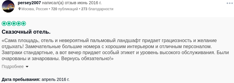 "Сказочный отель. Cама площадь, отель и невероятный пальмовый ландшафт придает грациозность и желание отдыхать! Замечательные большие номера с хорошим интерьером и отличным персоналом. Завтраки стандартные, а вот вечер придает особый этикет и уровень высокого обслуживания. Были очарованы и зачарованы. Вернусь обязательно!"