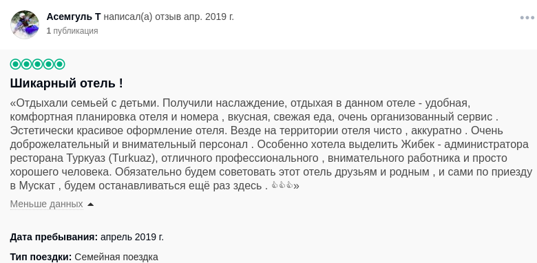 "Отдыхали семьей с детьми. Получили наслаждение, отдыхая в данном отеле - удобная, комфортная планировка отеля и номера, вкусная, свежая еда, очень организованный сервис. Эстетически красивое оформление отеля. Везде на территории отеля чисто, аккуратно. Очень доброжелательный и внимательный персонал. Особенно хотела выделить Жибек - администратора ресторана Туркуаз (Turkuaz), отличного профессионального, внимательного работника и просто хорошего человека. Обязательно будем советовать этот отель друзьям и родным, и сами по приезду в Мускат, будем останавливаться ещё раз здесь."