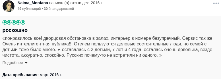 "Роскошно. Понравилось все! Дворцовая обстановка в залах, интерьер в номере безупречный. Сервис так же. Очень интеллигентная публика!!! Отелем пользуются деловые состоятельные люди, но семей с детьми тоже было много. Я оставалась с 2 детьми, 7 лет и 4 года, осталась очень довольна, везде чистота, аккуратно, спокойно. Русских почему-то не встретили ни одного".