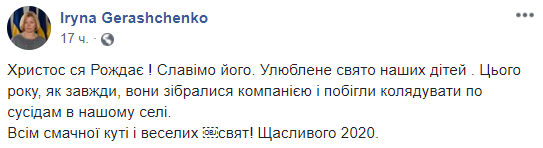 Соглава фракции "Европейская солидарность" Ирина Геращенко отметила, что Рождество - любимый праздник детей, которые по традиции колядовали по соседям в селе. "Всем вкусной кутьи и веселых праздников! Счастливого 2020 года", - пожелала политик.