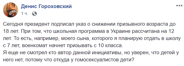 "Сегодня президент подписал указ о снижении призывного возраста до 18 лет. При том, что школьная программа в Украине рассчитана на 12 лет. То есть, например, моего сына, которого я планирую отдать в школу с 7 лет, военкомат начнет призывать с 10 класса.