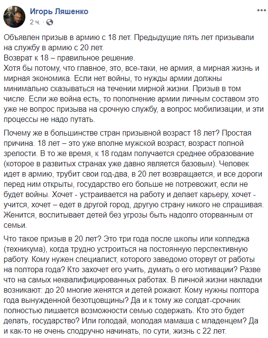 Что такое призыв в 20 лет? Это три года после школы или колледжа (техникума), когда трудно устроиться на постоянную перспективную работу. Кому нужен специалист, которого заведомо оторвут от работы на полтора года? Кто захочет его учить, думать о его мотивации? Разве что на самых неквалифицированных работах. В личной жизни накладки возникают: до 20 многие женятся и детей рожают. Кому нужны полтора года вынужденной безотцовщины? Да и к тому же солдат-срочник полностью лишается возможности семью содержать. Кто это будет делать, государство? Или голодай, молодая мамаша с младенцем? Да и как-то не очень сподручно начинать, по сути, жизнь с 22 лет", - считает журналист Игорь Ляшенко.