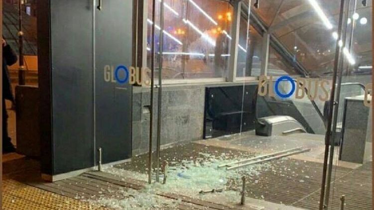 Разбитые двери в ТРЦ Globus Фото: facebook.com/kievtypical