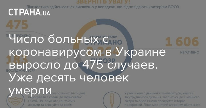 В Украине зафиксировано 475 случаев коронавирусной болезни COVID-19. Десять чеоовек в Украине погибли от осложнений болезни. Шесть случаев закончились выздоровлением.