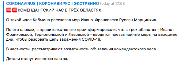 "По его словам, в правительстве его проинформировали, что в трех областях - Ивано-Франковской, Тернопольской и Львовской - вводятся чрезвычайные меры на выходные дни, чтобы разорвать цепь заражения COVID-19. В частности, рассматривают возможность объявления комендантского часа. Детали станут известны завтра".