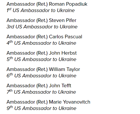 Обращение подписали отставные 1-й посол США в Украине Роман Попадюк, 3-й посол США в Украине Стивен Пайфер, 4-й посол США в Украине Карлос Паскуаль, 5-й посол США в Украине Джон Хербст, 6-й посол США в Украине Уильям Тейлор, 7-й посол США в Украине Джон Теффт и 9-й посол США в Украине Мари Йованович.