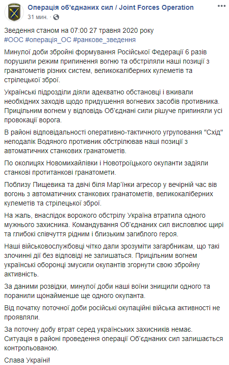 "За прошедшие сутки вооруженные формирования Российской Федерации 6 раз нарушили режим прекращения огня и обстреляли наши позиции из гранатометов различных систем, крупнокалиберных пулеметов и стрелкового оружия…К сожалению, в результате вражеского обстрела Украина потеряла одного мужественного защитника", - говорится в сообщении, на официальной странице штаба ООС в Facebook в среду утром.