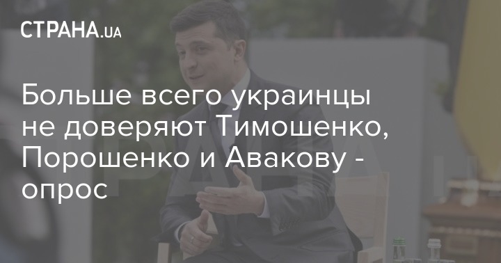 В тройку политиков, которым доверяют менее всего входят министр внутренних дел Арсен Аваков - 77% недоверия против 13% доверия. Лидеру ВО "Батькивщина" Юлии Тимошенко 79% и 14% соответственно, а экс-президенту и нардепу от "Европейской солидарности" Петру Порошенко 77% и 17% соответственно.