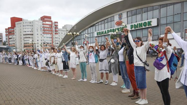 У Комаровского рынка в Минске около двух сотен девушек выстроились в живую цепь с цветами в руках в знак мирного протеста против насилия в Белоруссии, которое продолжается после выборов президента.