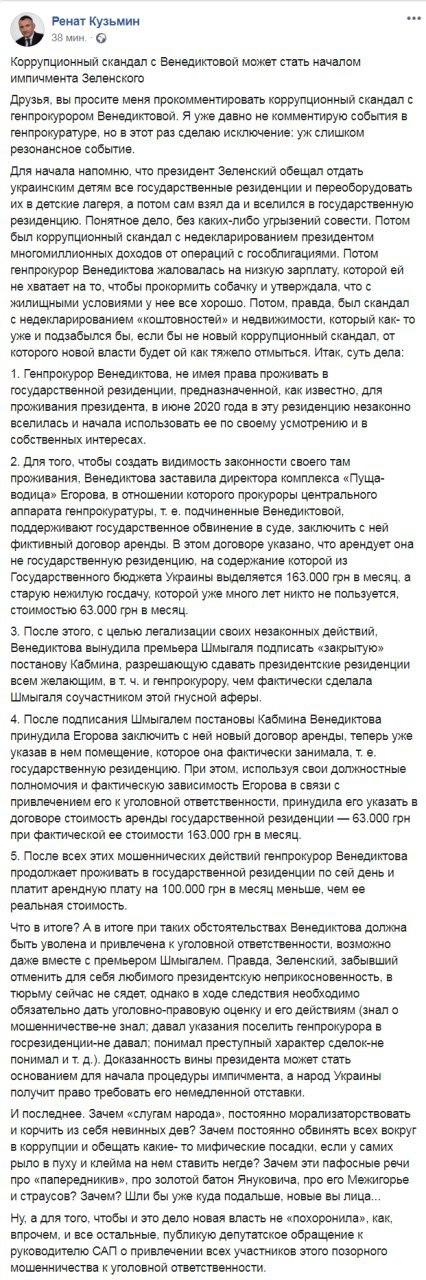 1. Генпрокурор Венедиктова, не имея права проживать в государственной резиденции, предназначенной, как известно, для проживания президента, в июне 2020 года в эту резиденцию незаконно вселилась и начала использовать ее по своему усмотрению и в собственных интересах.