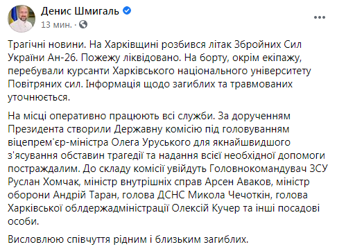 "Выражаю сочувствие родным и близким погибших", - добавил Шмыгаль.