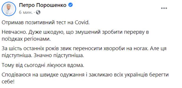 Информация о положительном тесте появилась на странице Порошенко в Facebook.