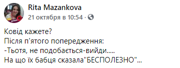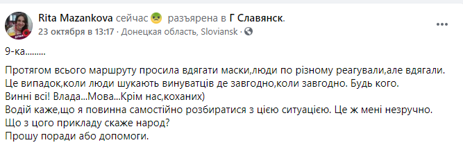 "На протяжении всего маршрута просила надевать маски, люди по-разному реагировали, но одевали. Это случай, когда люди ищут виновных где угодно, когда угодно. Кого угодно. Виноваты все! Власть ... Язык ... Кроме нас, любимых", - прокомментировала она инцидент в марштурке.