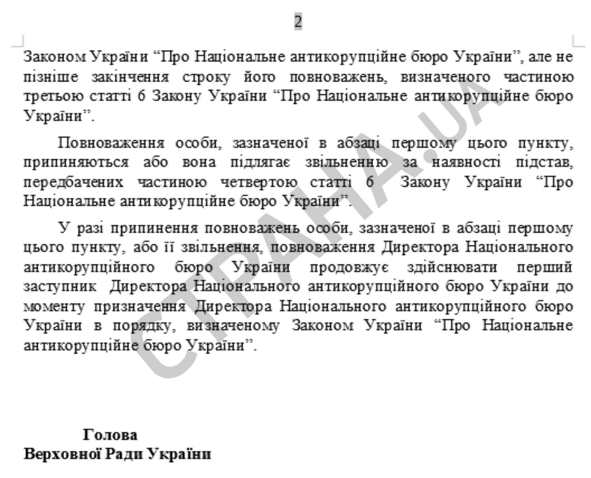 Также в переходных положениях, содержится норма, по которой нынешний глава НАБУ исполняет свои обязанности до принятия закона, но не позже, чем истекает срок его полномочий.