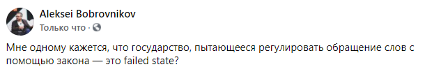 11:00  "Мне одному кажется, что государство, пытающееся регулировать обращение слов с помощью закона — это failed state?", - спрашивает журналист Алексей Бобровников.